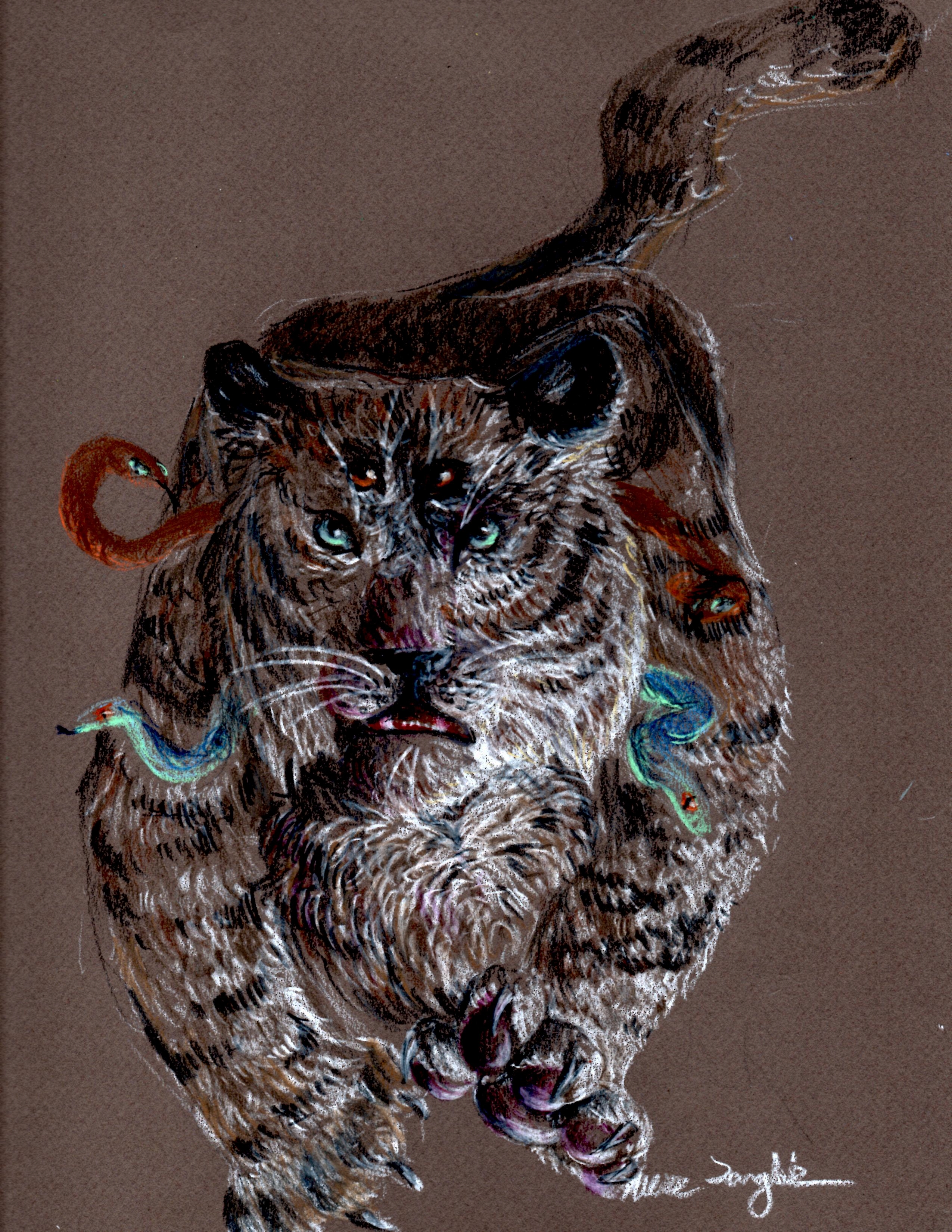 Colored Pencil Tiger Traditional Art This was a piece done in colored pencil on pastel paper! It depicts the tiger goddess, a creature I once saw in a dream and can’t stop incorporating into my art. Share this: Click to share on X (Opens in new window) X Click to share on Facebook (Opens in new window) Facebook Like Loading... Related