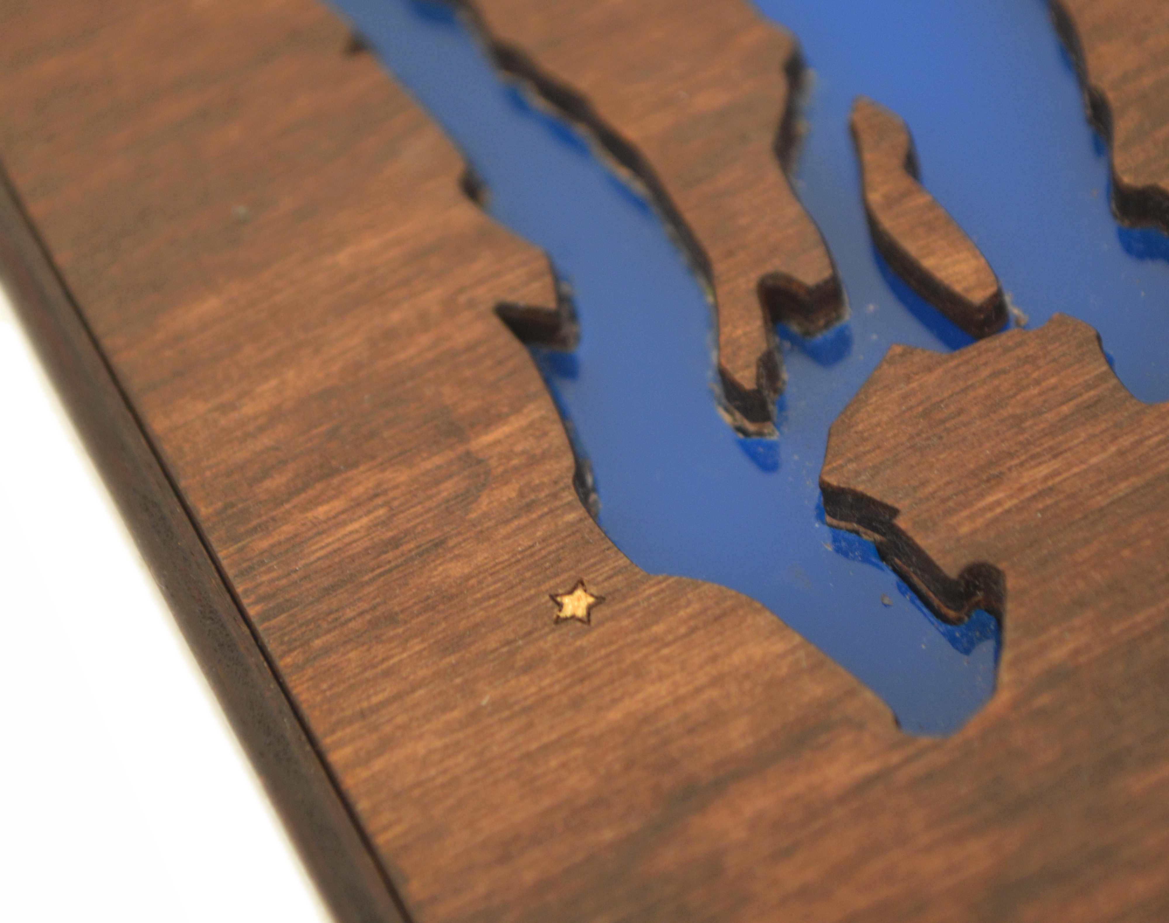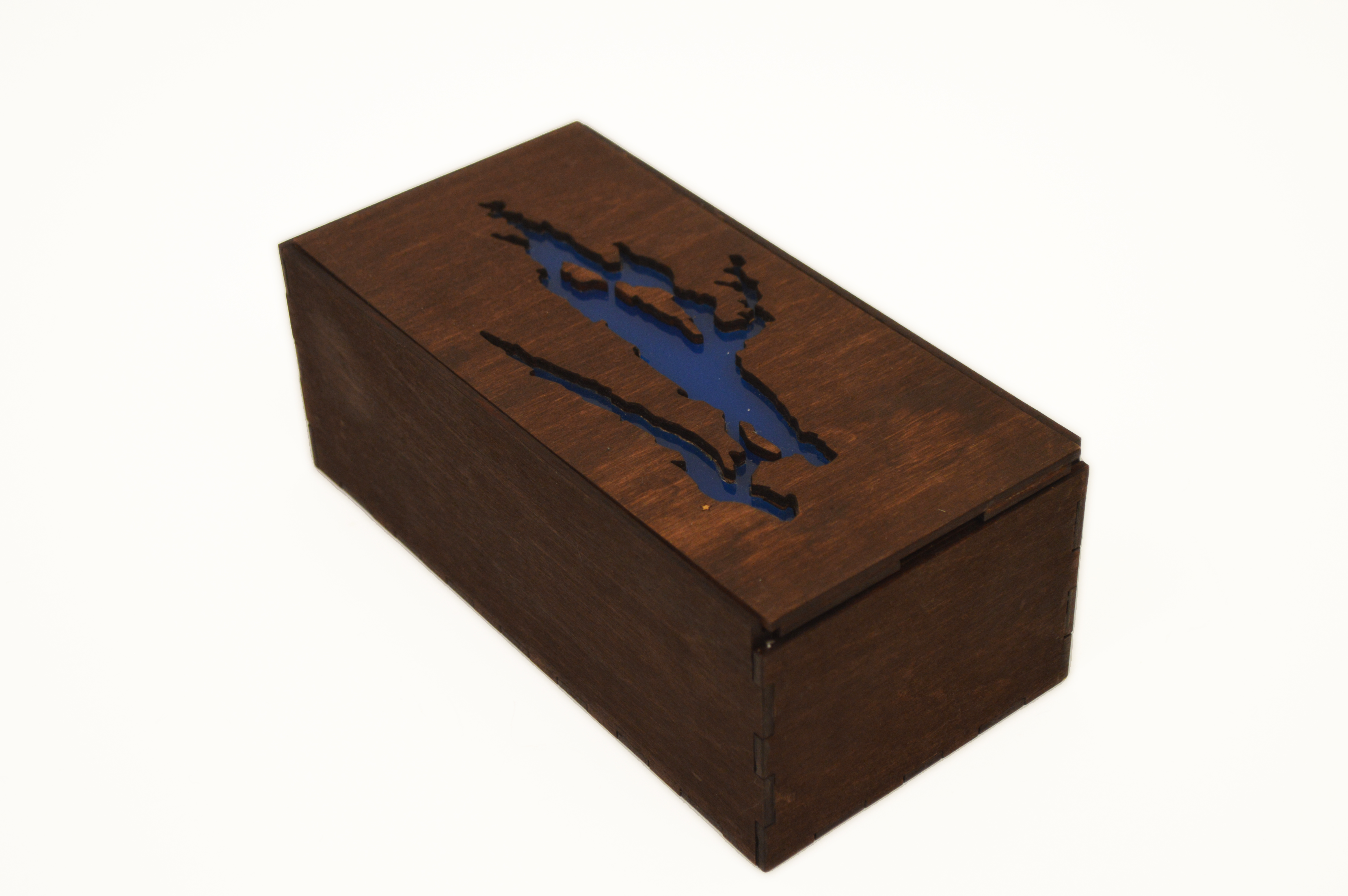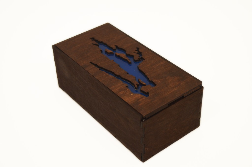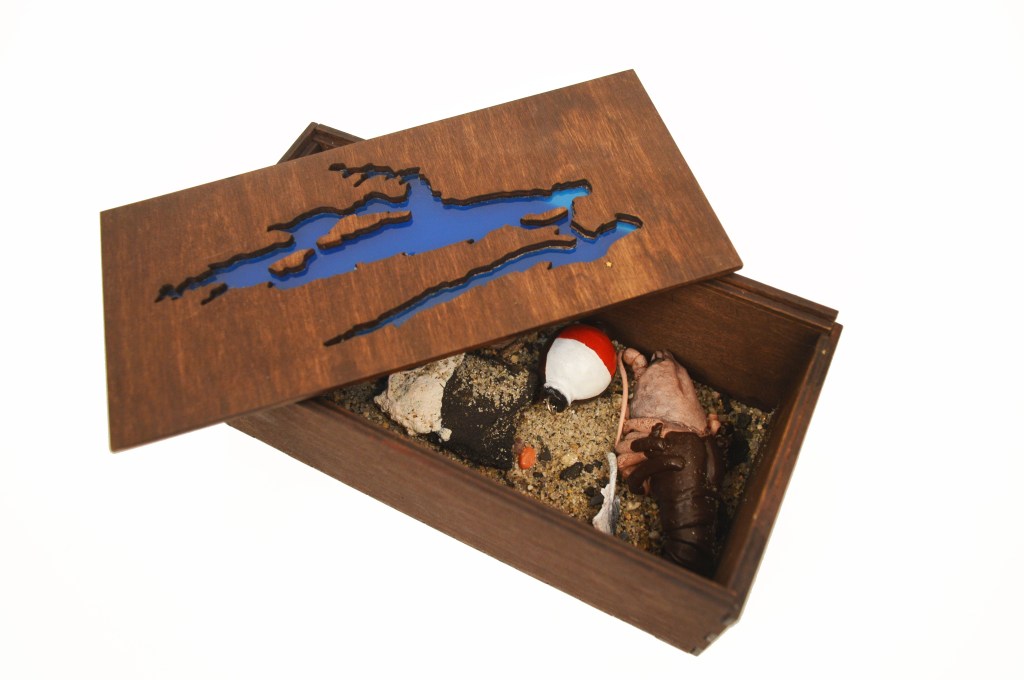 The wooden box features an acrylic inlay of the reservoir, with a tiny star that represents my house. Inside the box, nestled in sand I collected from Quabbin’s shores, are replaces of objects that I have found there over the years. Each object is dipped in a thick coat of acrylic “chocolate,” to create a visual dissonance of strange/enticing. On the walls of the box are faintly engraved roadmaps of the four towns that were flooded, showing distorted pathways and lettering.