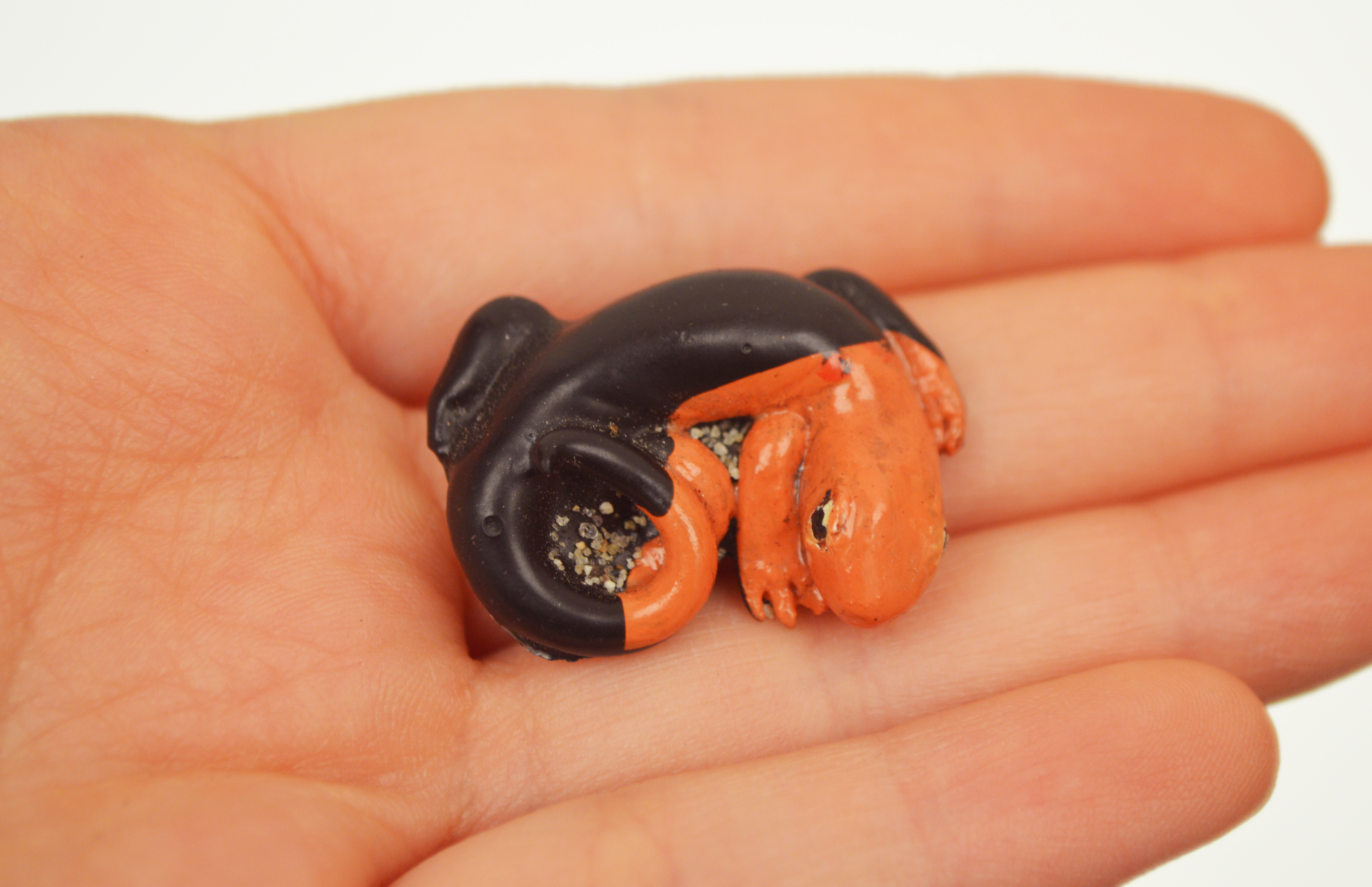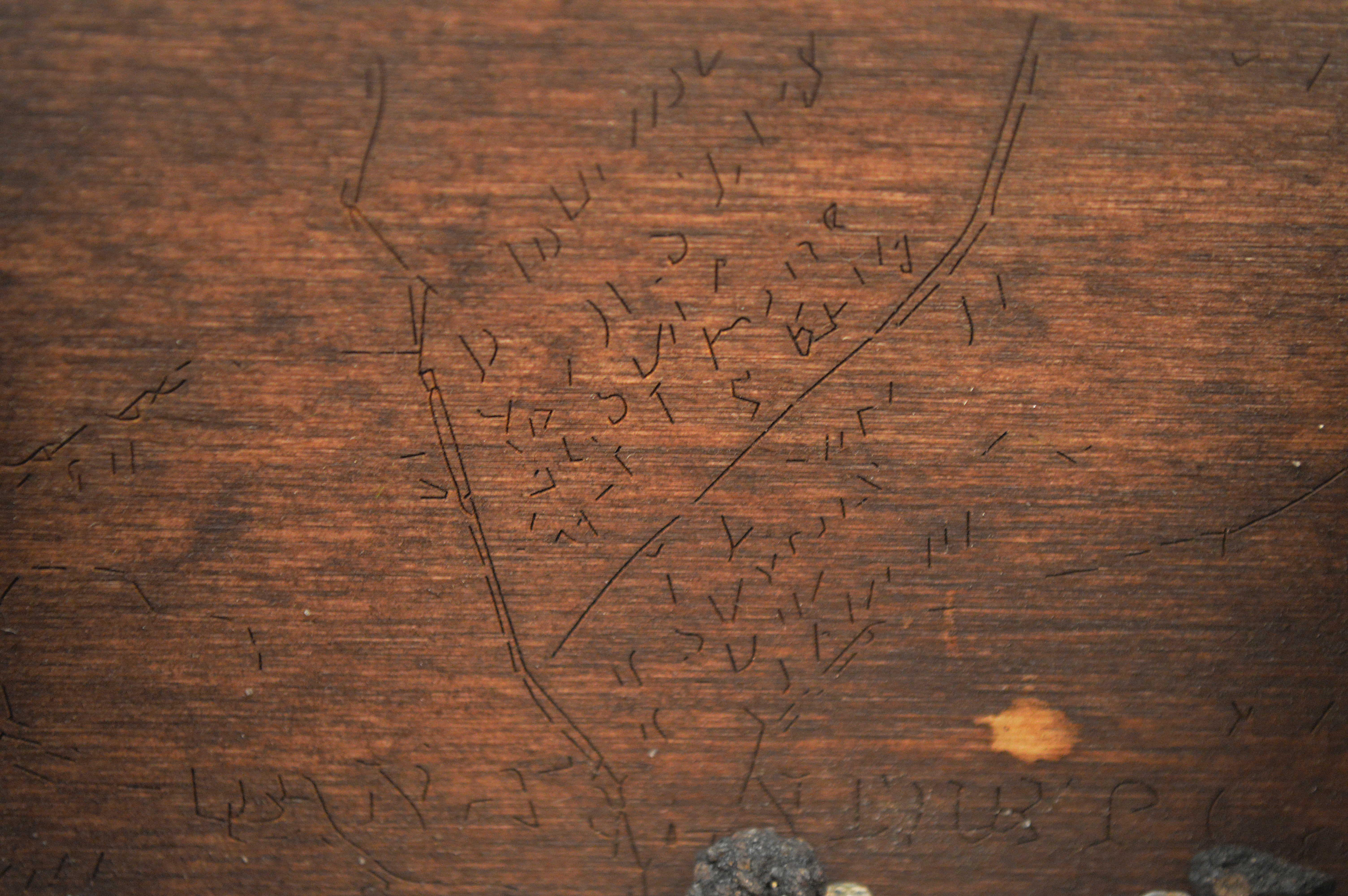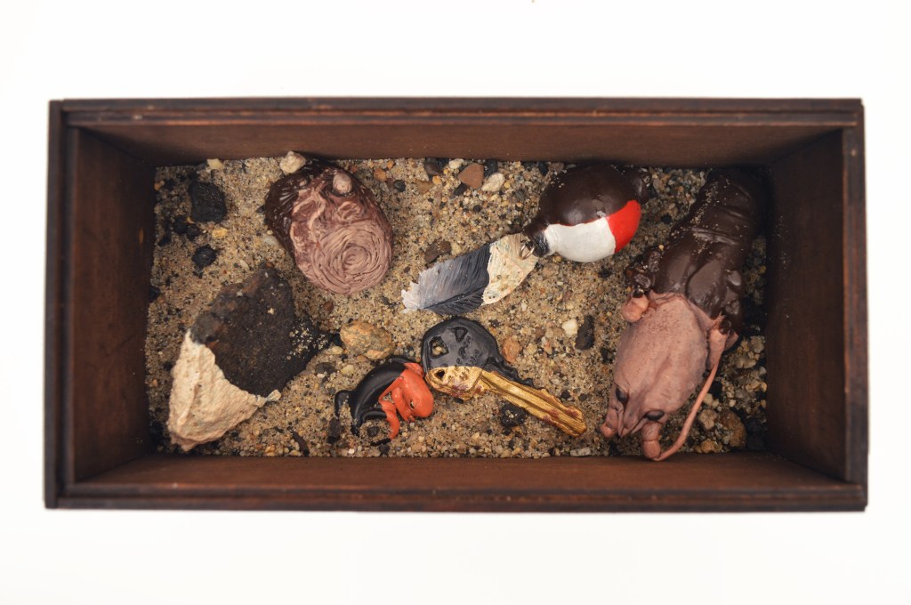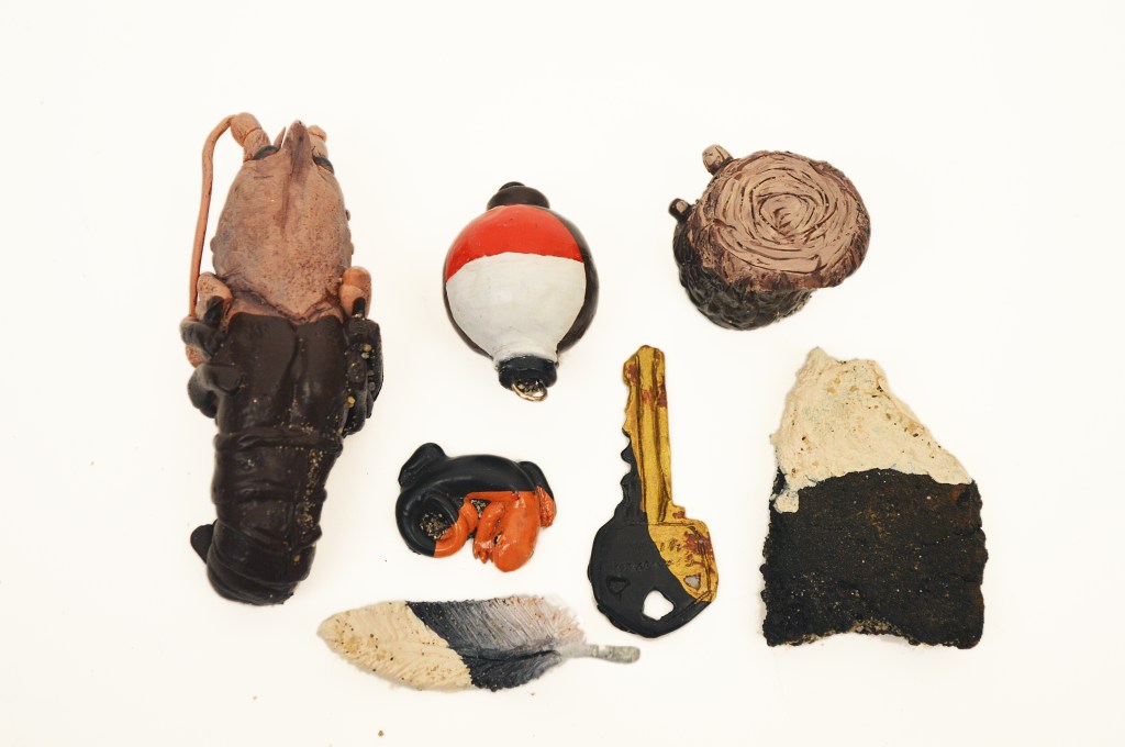 The wooden box features an acrylic inlay of the reservoir, with a tiny star that represents my house. Inside the box, nestled in sand I collected from Quabbin’s shores, are replaces of objects that I have found there over the years. Each object is dipped in a thick coat of acrylic “chocolate,” to create a visual dissonance of strange/enticing. On the walls of the box are faintly engraved roadmaps of the four towns that were flooded, showing distorted pathways and lettering.